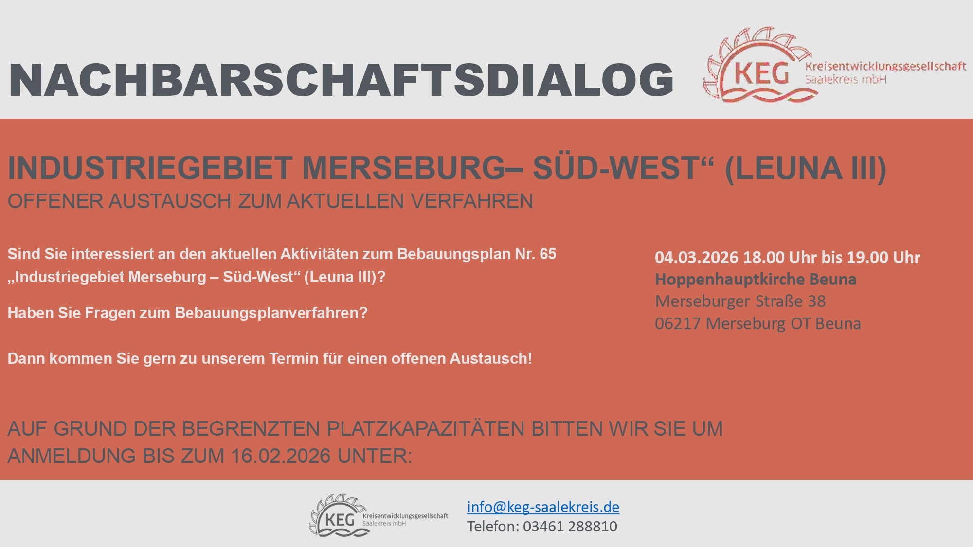 Wir möchten Sie bitten, sich auf Grund der begrenzten Platzkapazitäten vorab bis zum 16.02.2026 für den Nachbarschaftsdialog unter info@keg-saalekreis.de oder Tel. 03461 28 88 10 anzumelden.